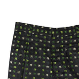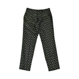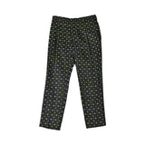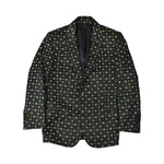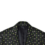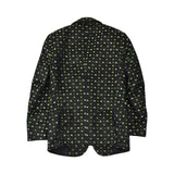 Valentino suit in black silk with shamrock jacquard, 2 buttons on the jacket, and tapered trousers.