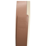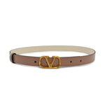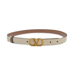Valentino reversible thin belt in blush pink on one side and white on the other. Features gold 'V' buckle and black glue trim.