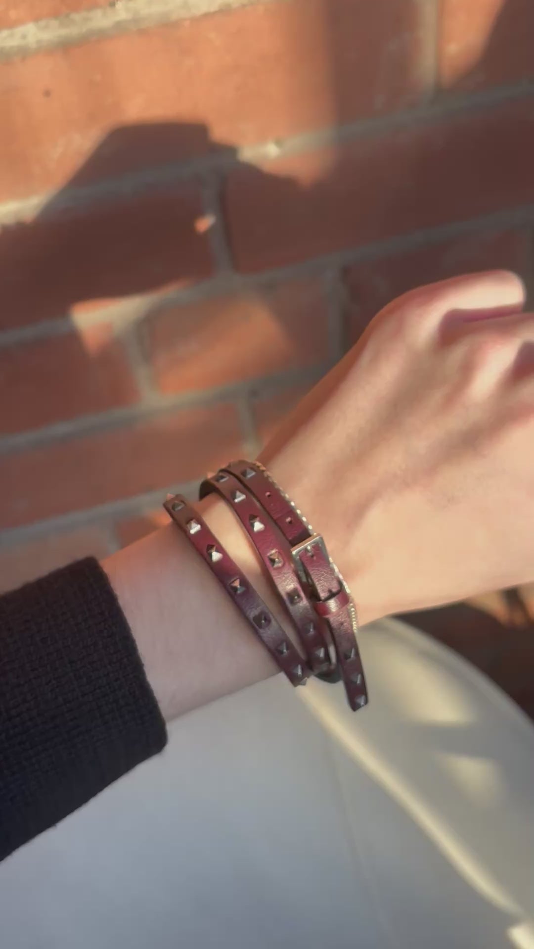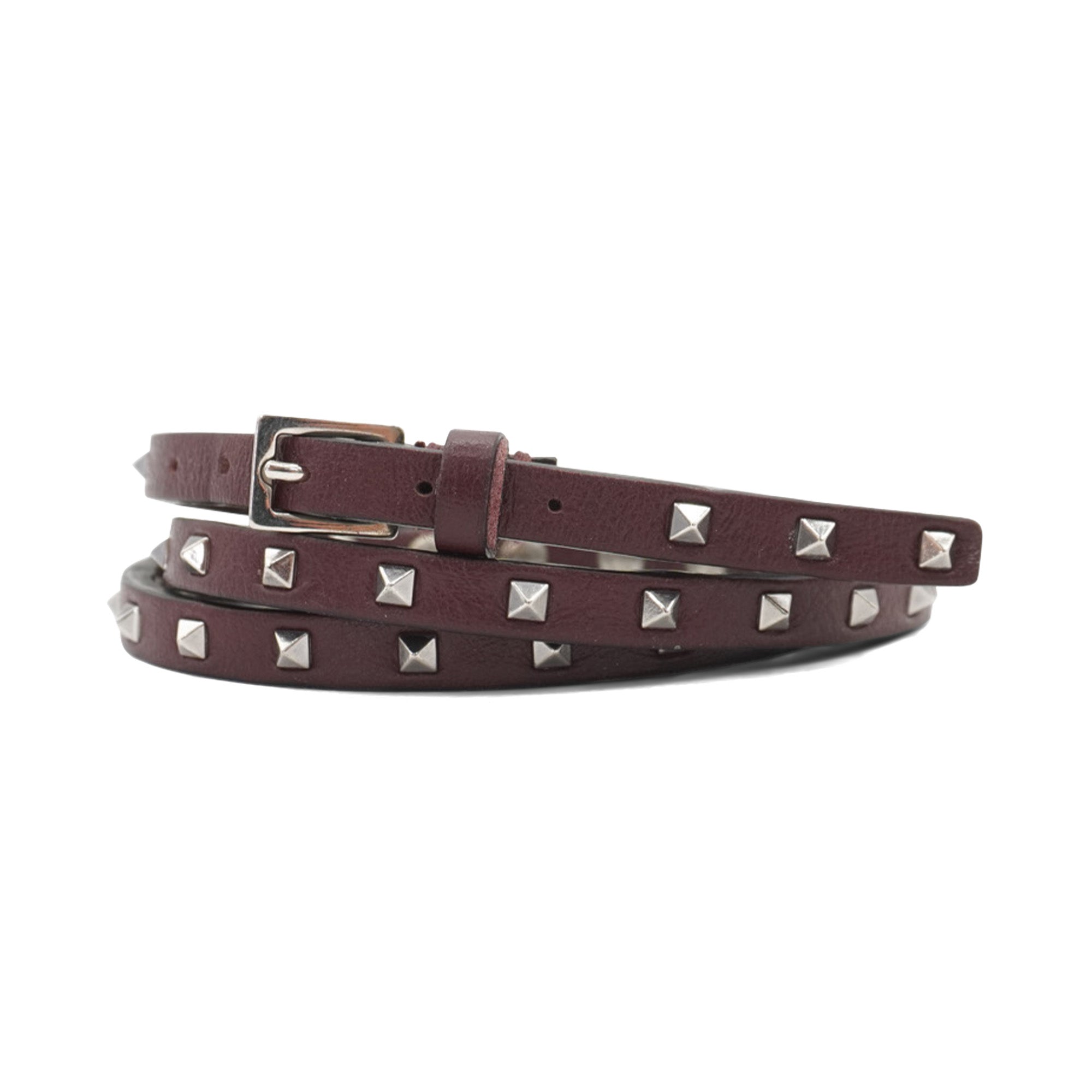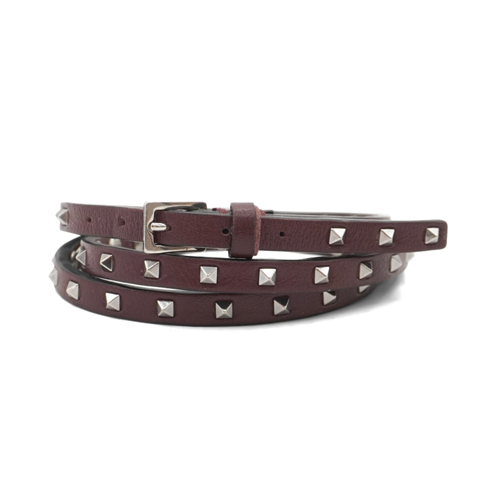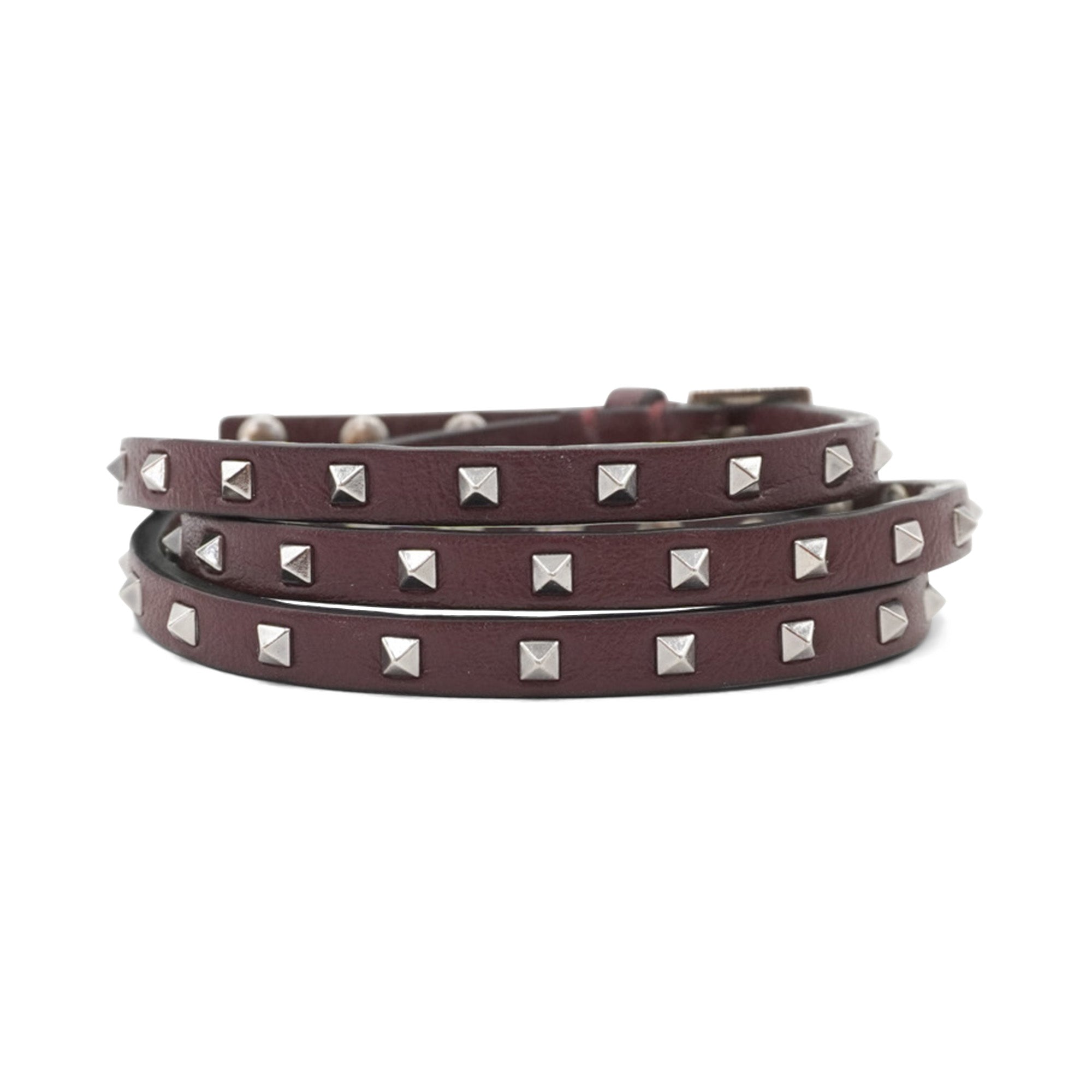 Valentino triple wrap bracelet in oxblood leather with silver rockstud hardware throughout and a buckle closure.