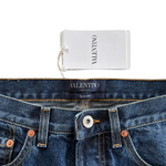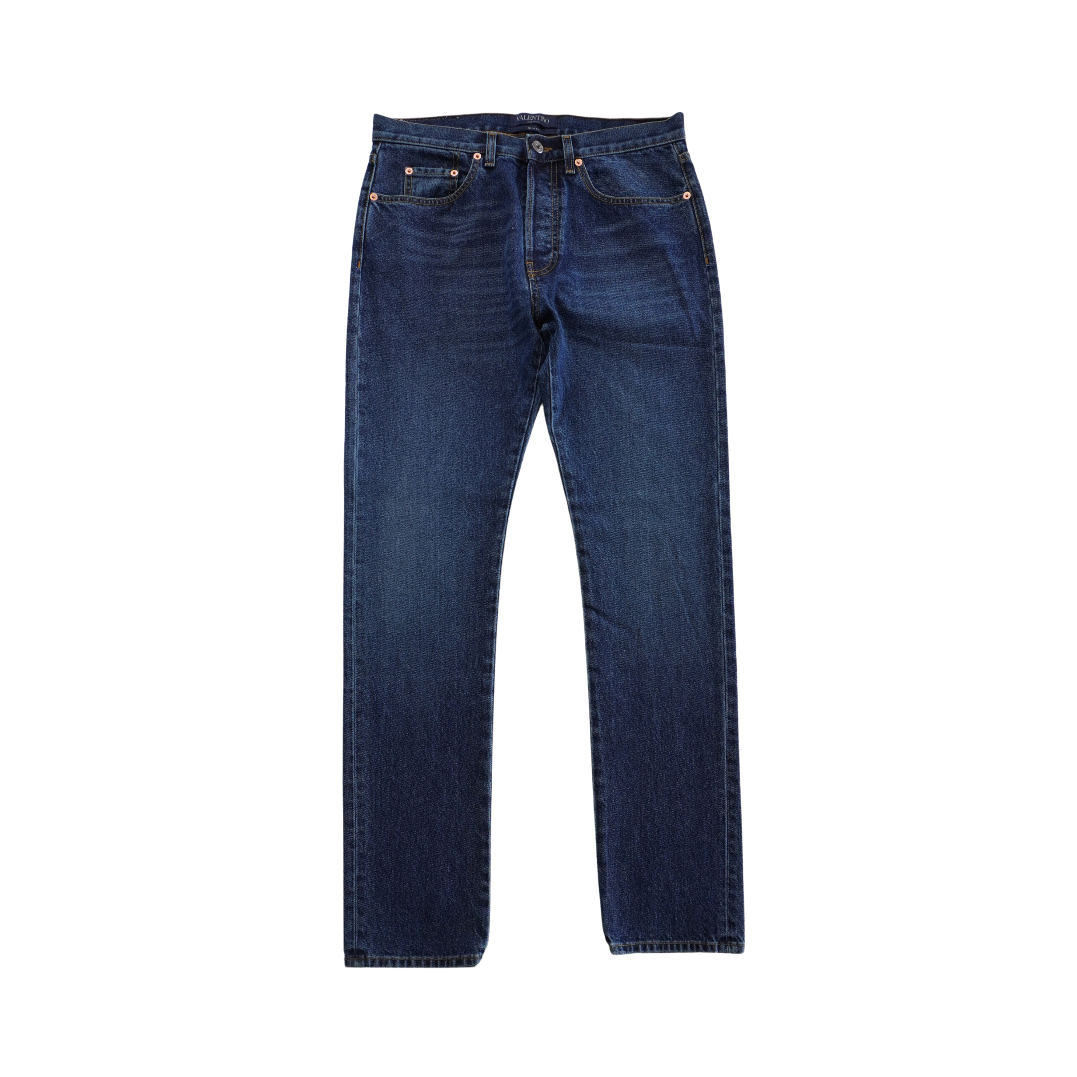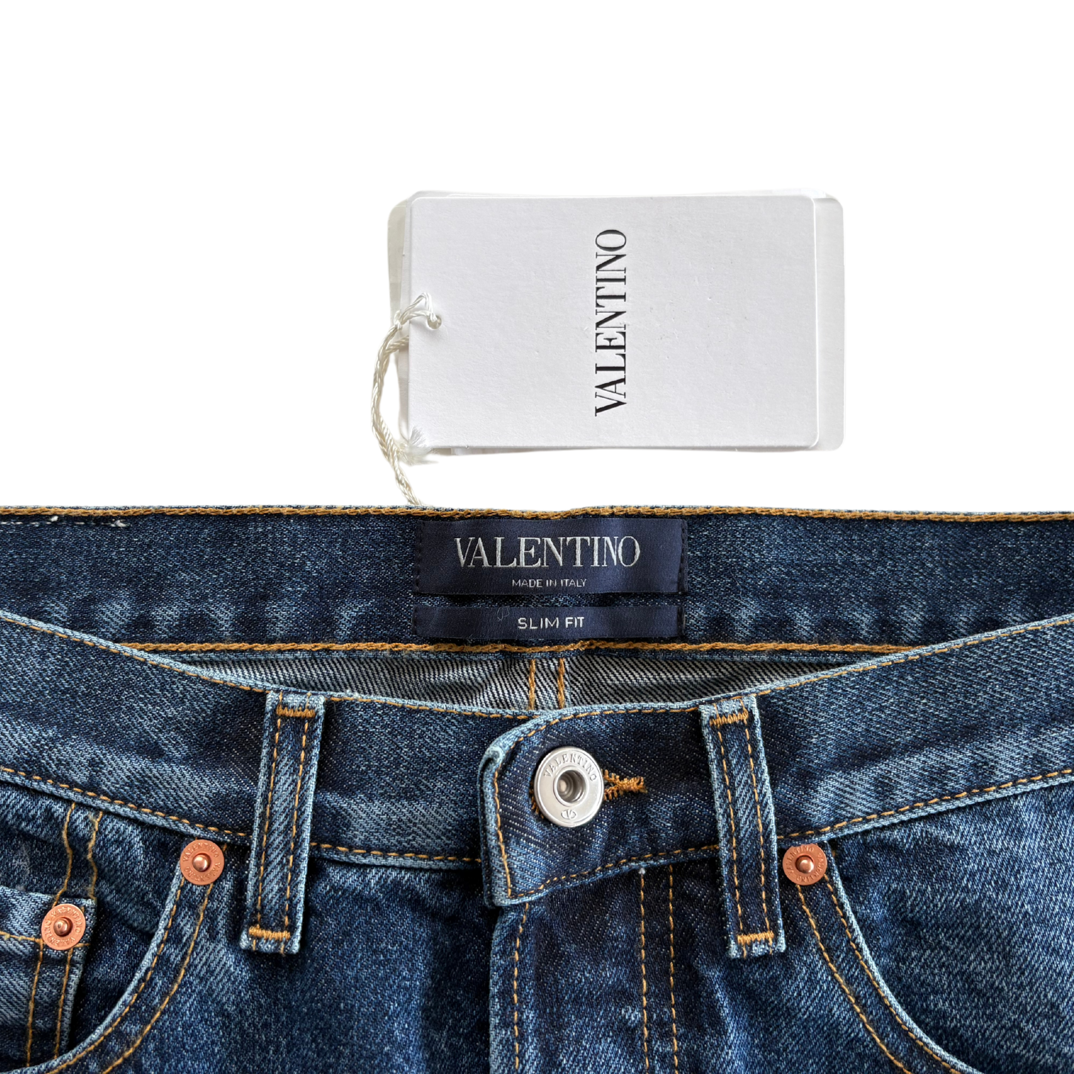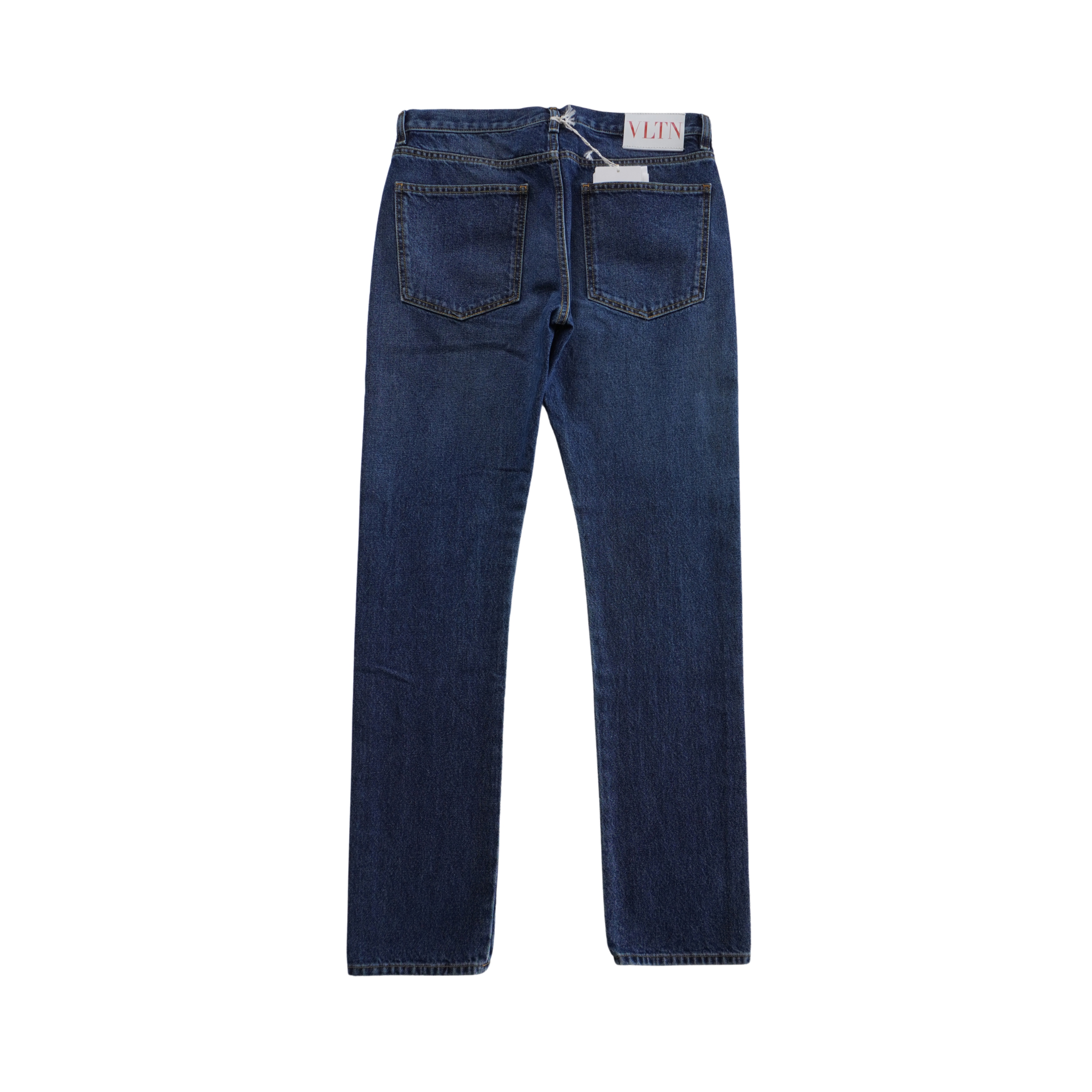 Valentino slim-fit jeans in medium blue denim with a front button opening and a white and red 'VLTN' leather logo patch on the back waist.