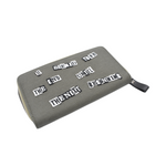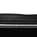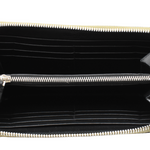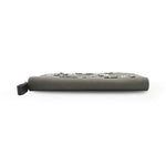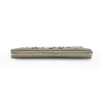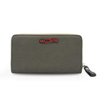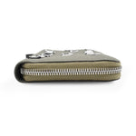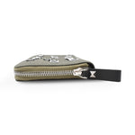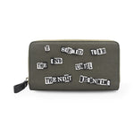 Valentino x Jamie Reid continental wallet in army green canvas with black and white text graphic patches on the front and a red and black 'Valentino' logo patch on the back. Features a zip-around opening in silver hardware with a black leather pull tab and a signature pyramid rockstud in silver hardware.