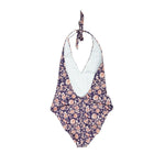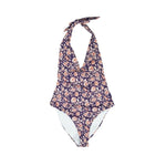 Veronica beard one-piece halter bathing suit in dark purple nylon with an all-over orange and cream floral print.