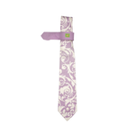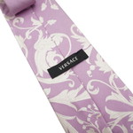 Versace tie in lavender and white baroque pattern with small green medusa head at the end.