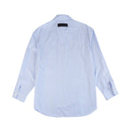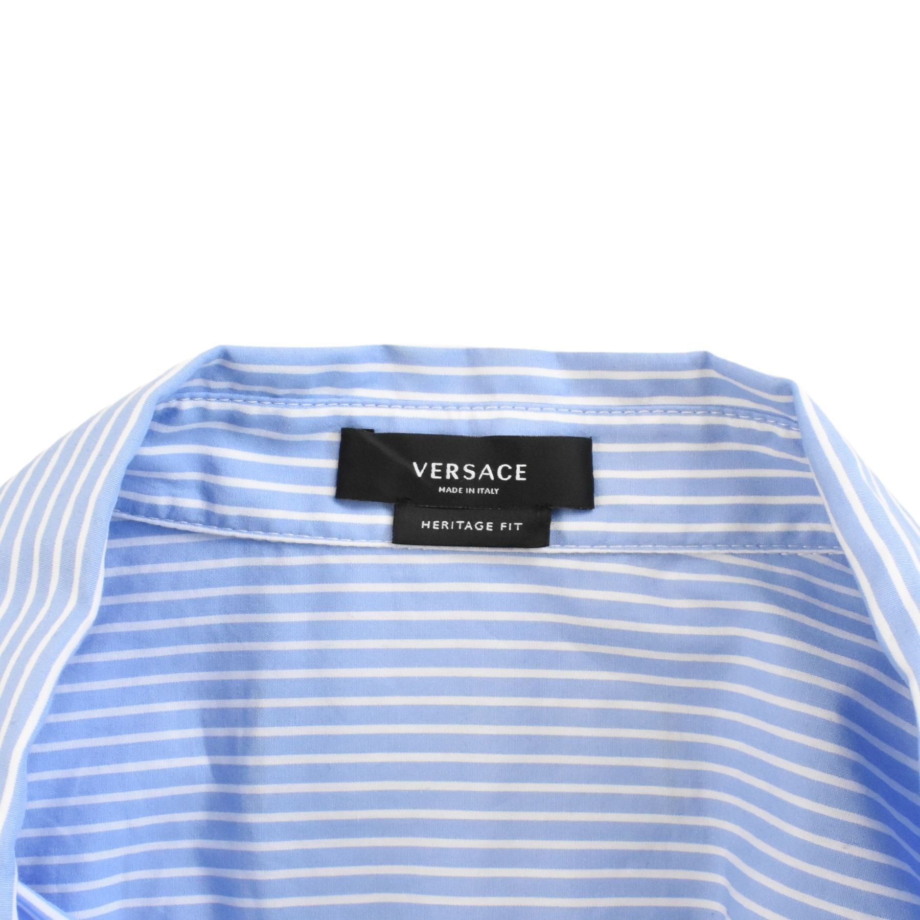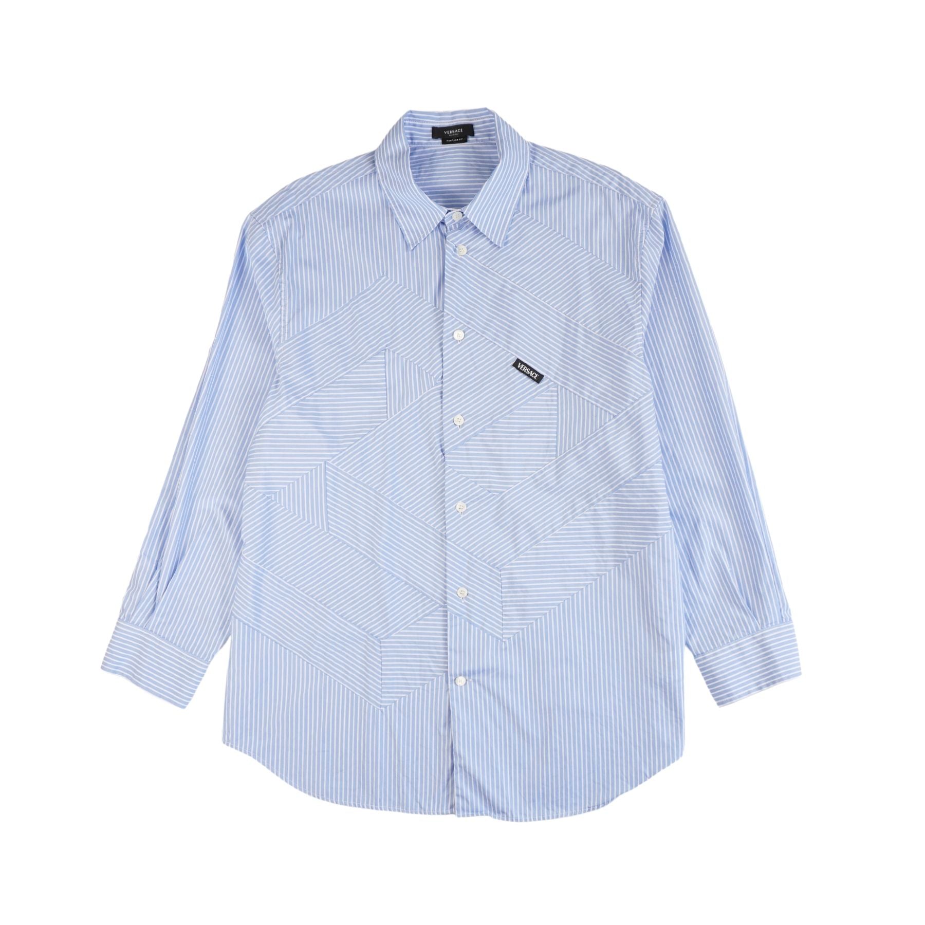 Versace long-sleeve button-down shirt in blue and white striped cotton. Features a satin patch on the upper back, white pearl button closure, and crossed stripe panel detail on the front.