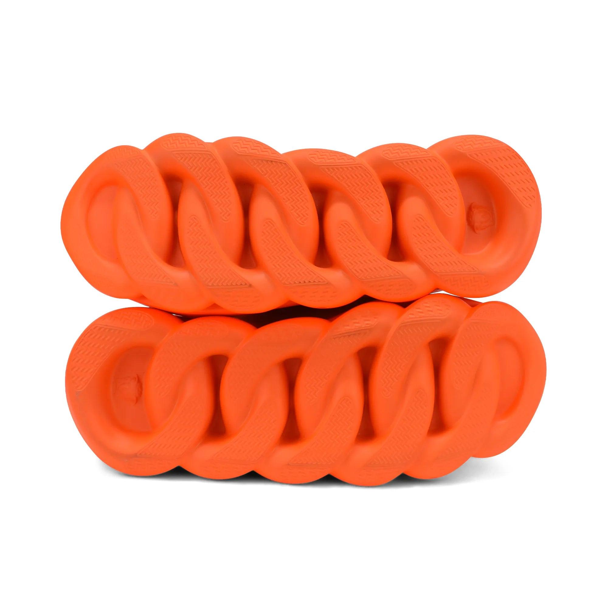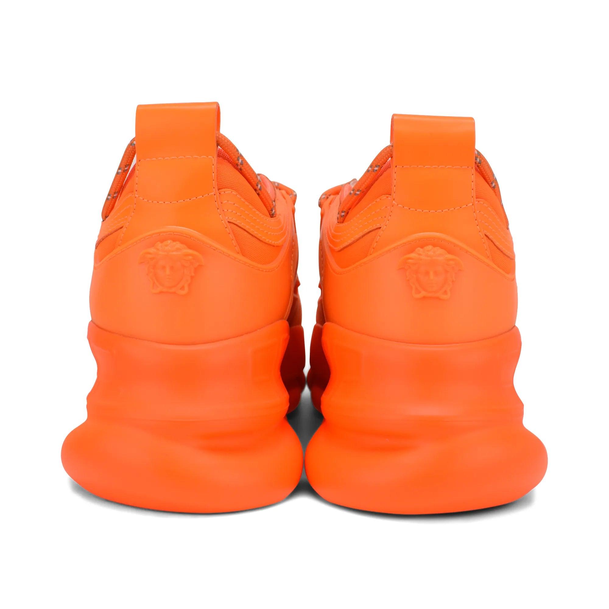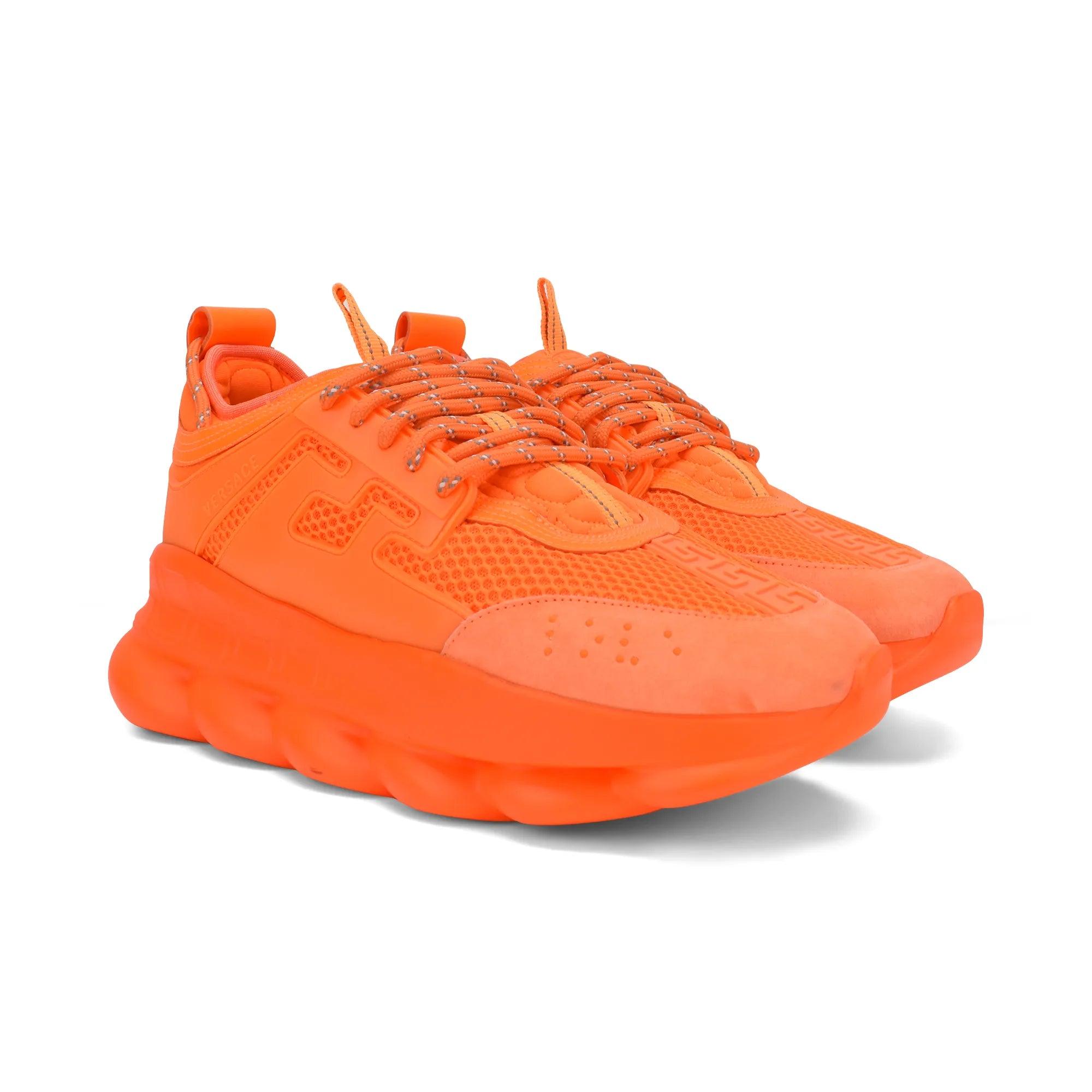 Versace 'Chain React' chunky sneakers in neon orange. Featuring mesh and suede panelling throughout with rubber cutout detailing, a padded tongue, rolled laces in orange, chain-shaped sole, and plastic medusa head on the heel.