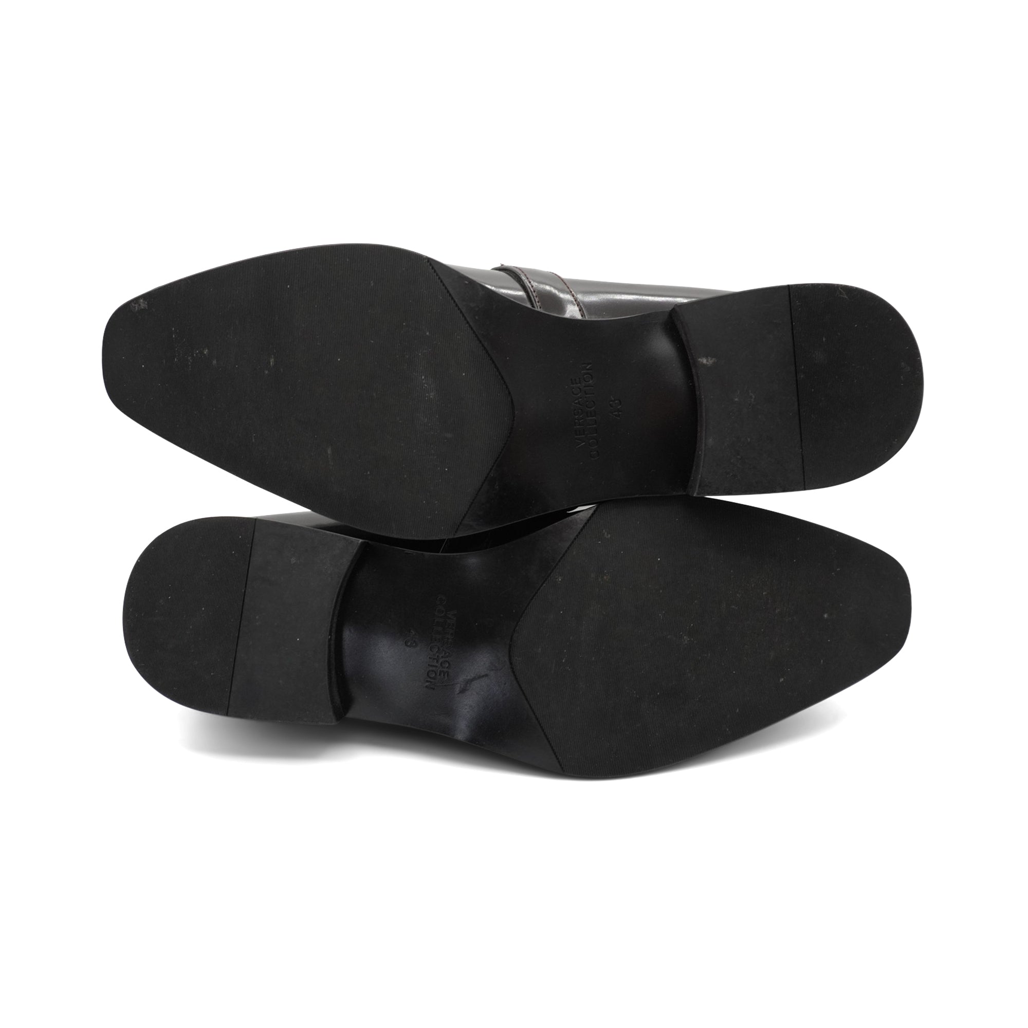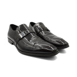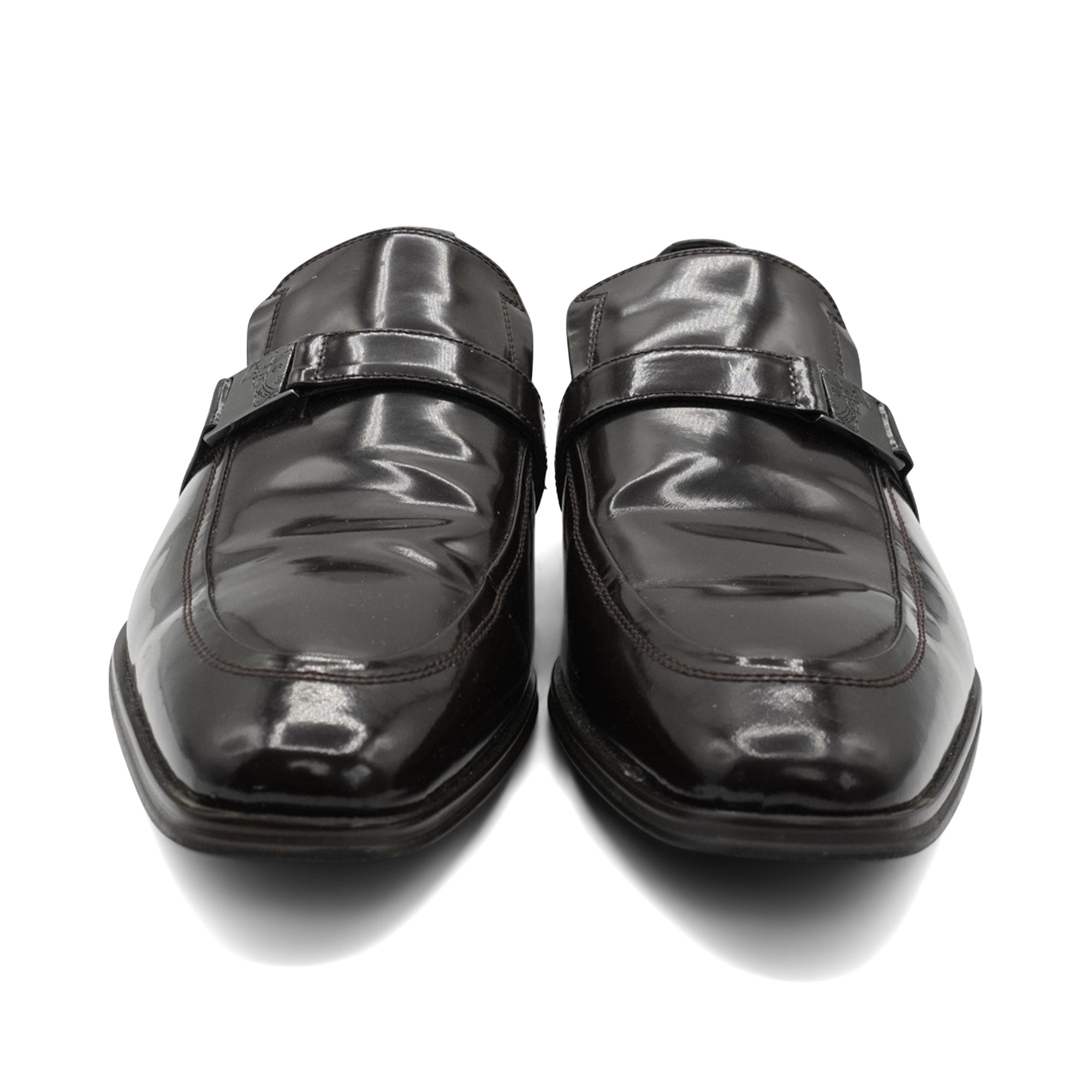 Versace dress shoes in brown patent leather with a gunmetal buckle detail with medusa head embossing and a tonal sole.