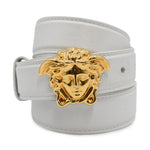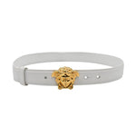Versace white leather belt with gold Medusa head buckle.