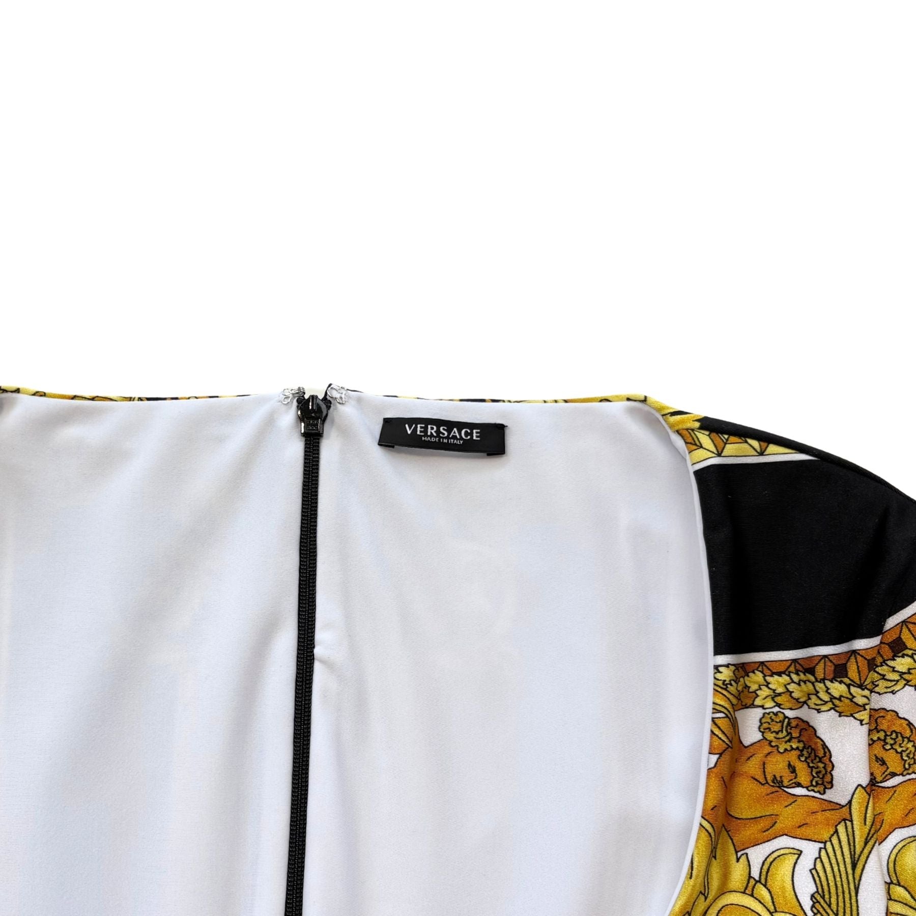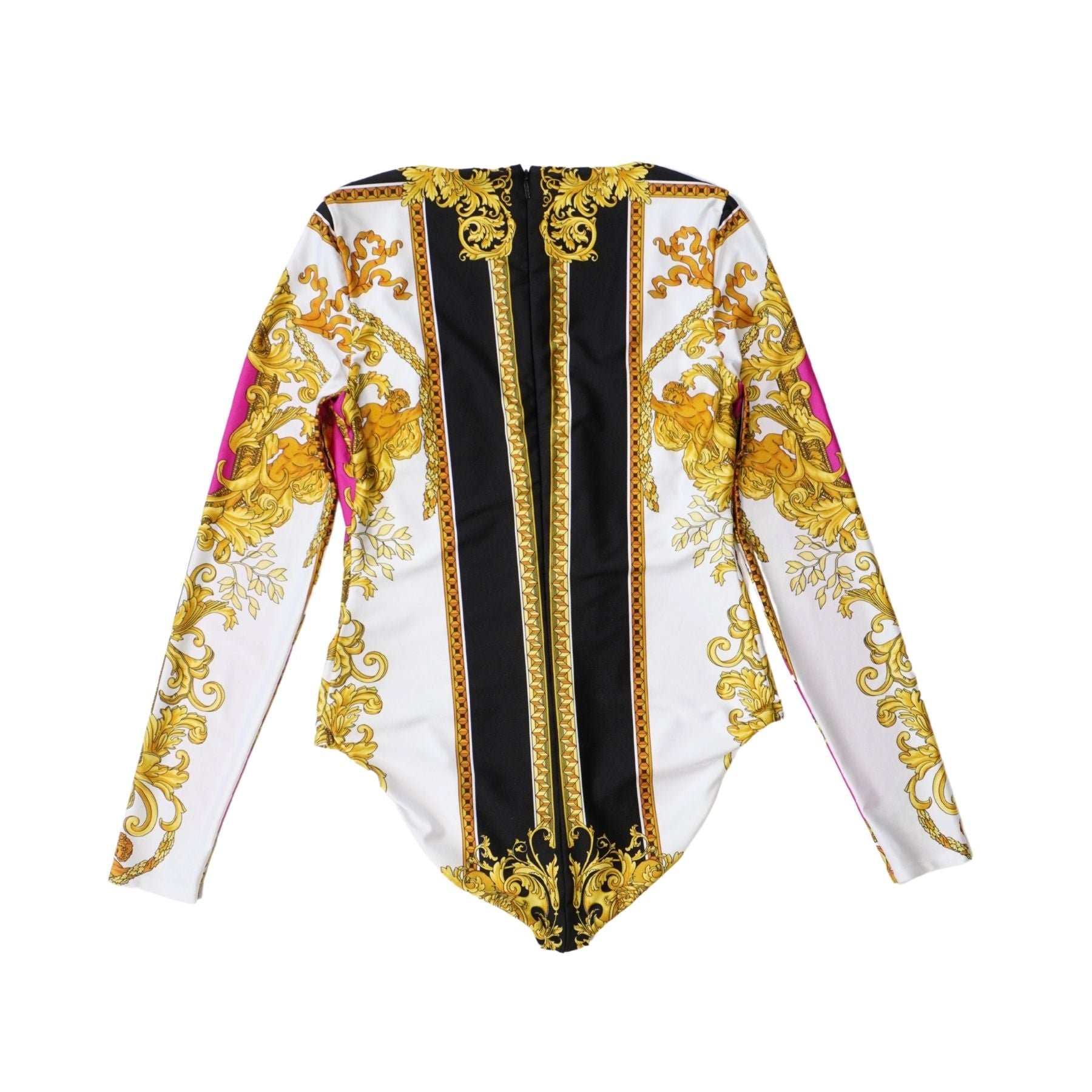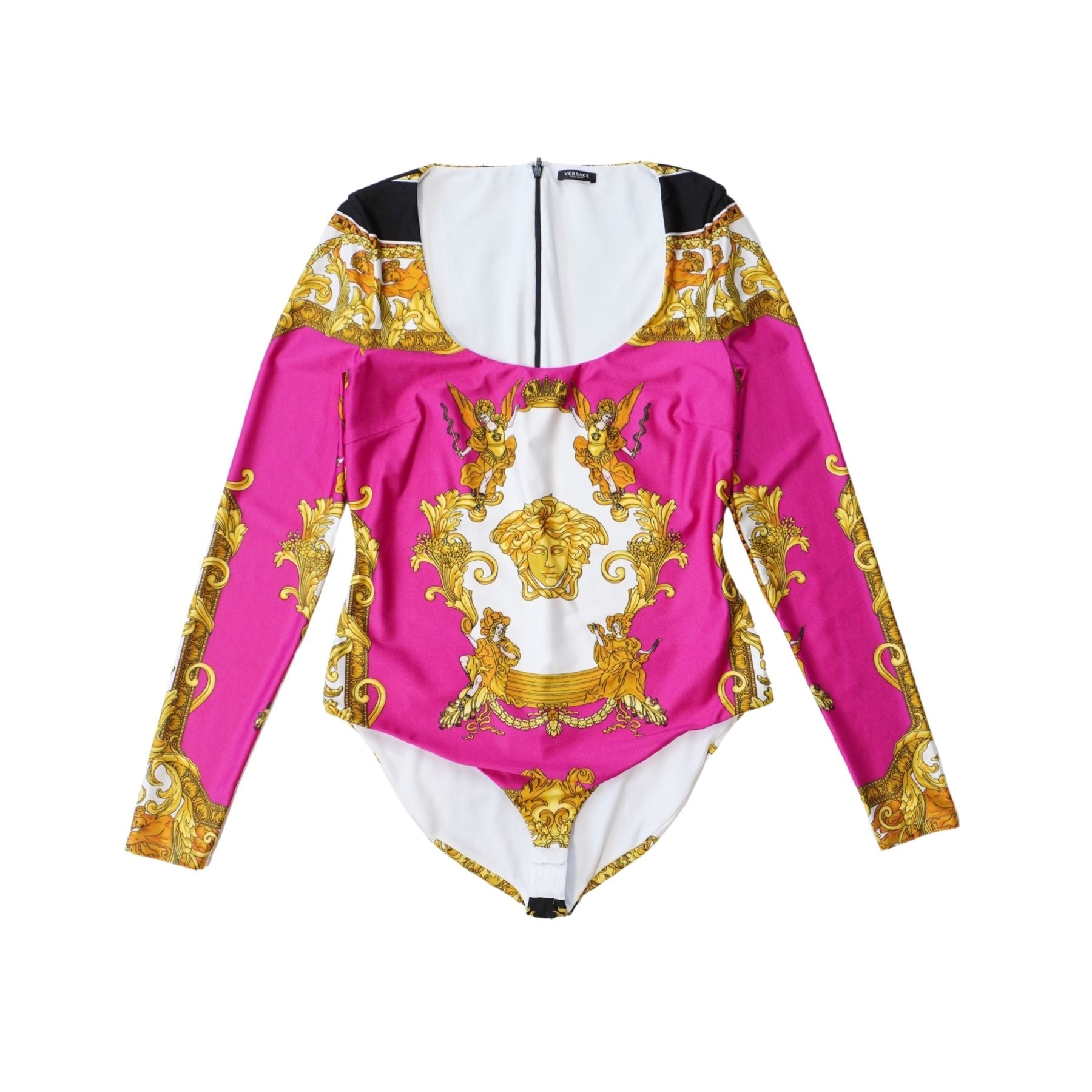 Versace long-sleeved bodysuit in bright pink with all-over gold, black and white ornate medusa graphics.