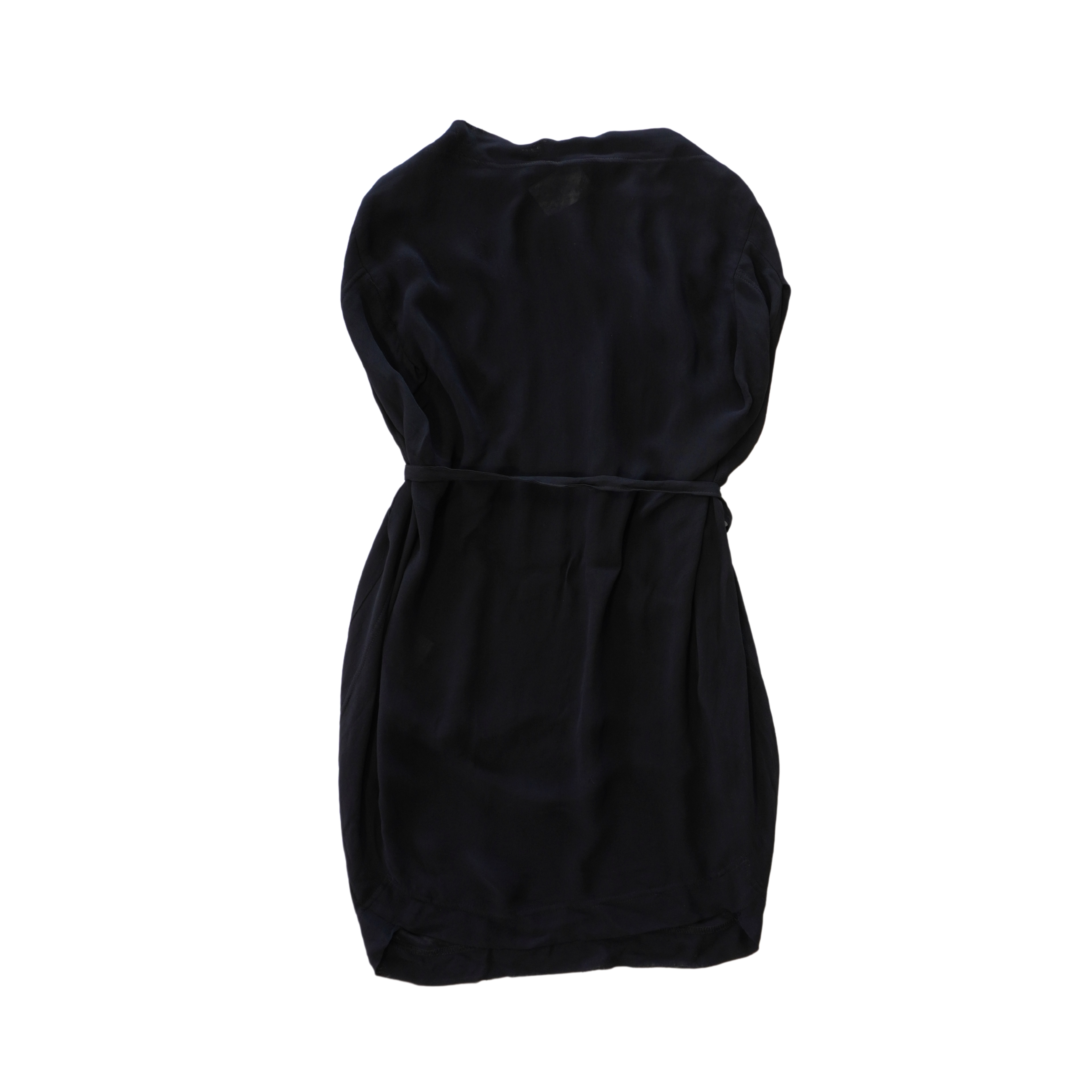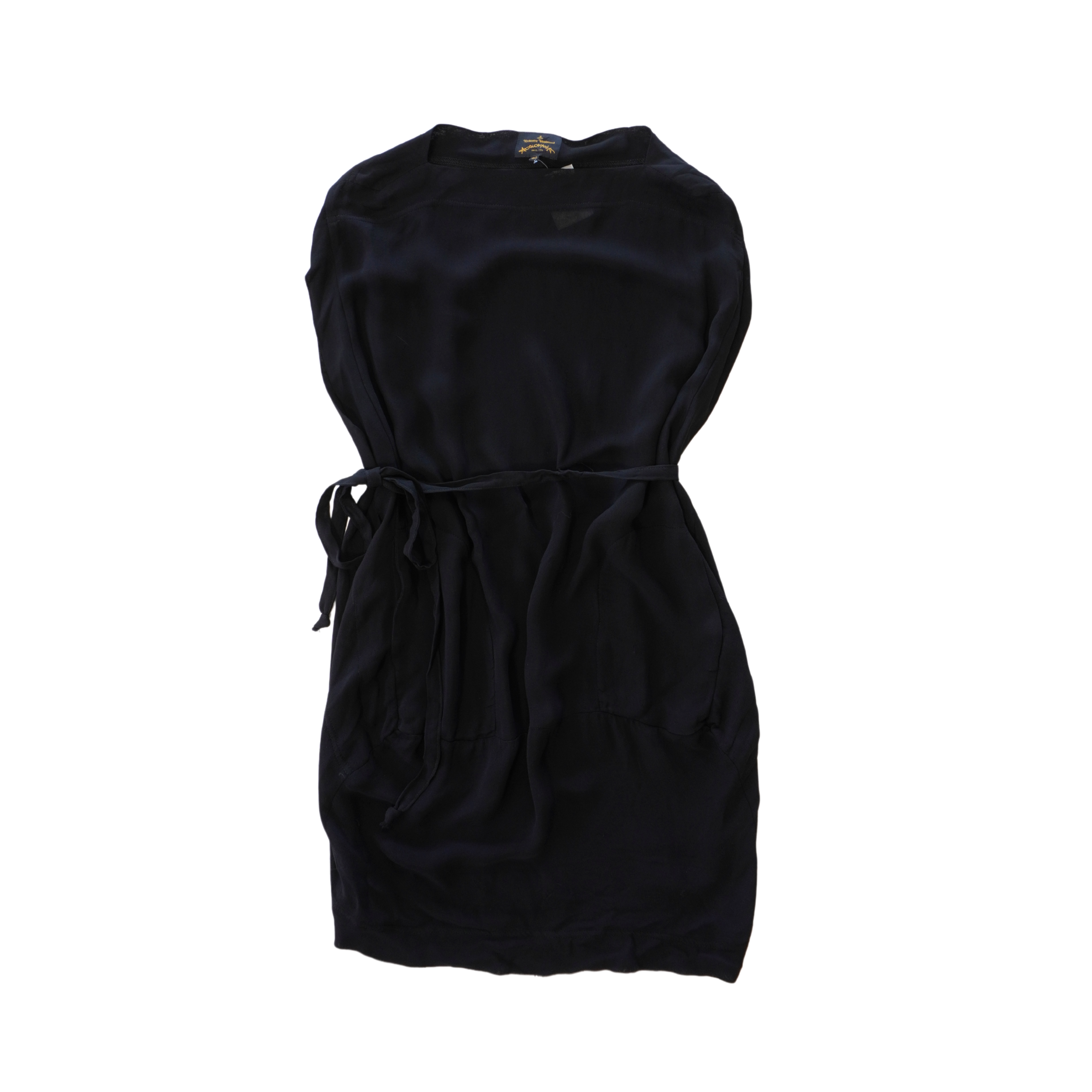 Vivienne Westwood Anglomania tunic blouse in semi-sheer viscose with a scoop hem, front slip pockets, and a tie at the waist.