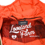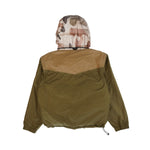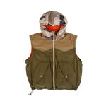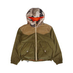 Woolrich light-weight puffer jacket in olive green and beige nylon with a camo printed hood, a beige zip closure, and a reversible neon orange side. Features detachable sleeves, flap pockets, inner open pockets and adjustable waistband.