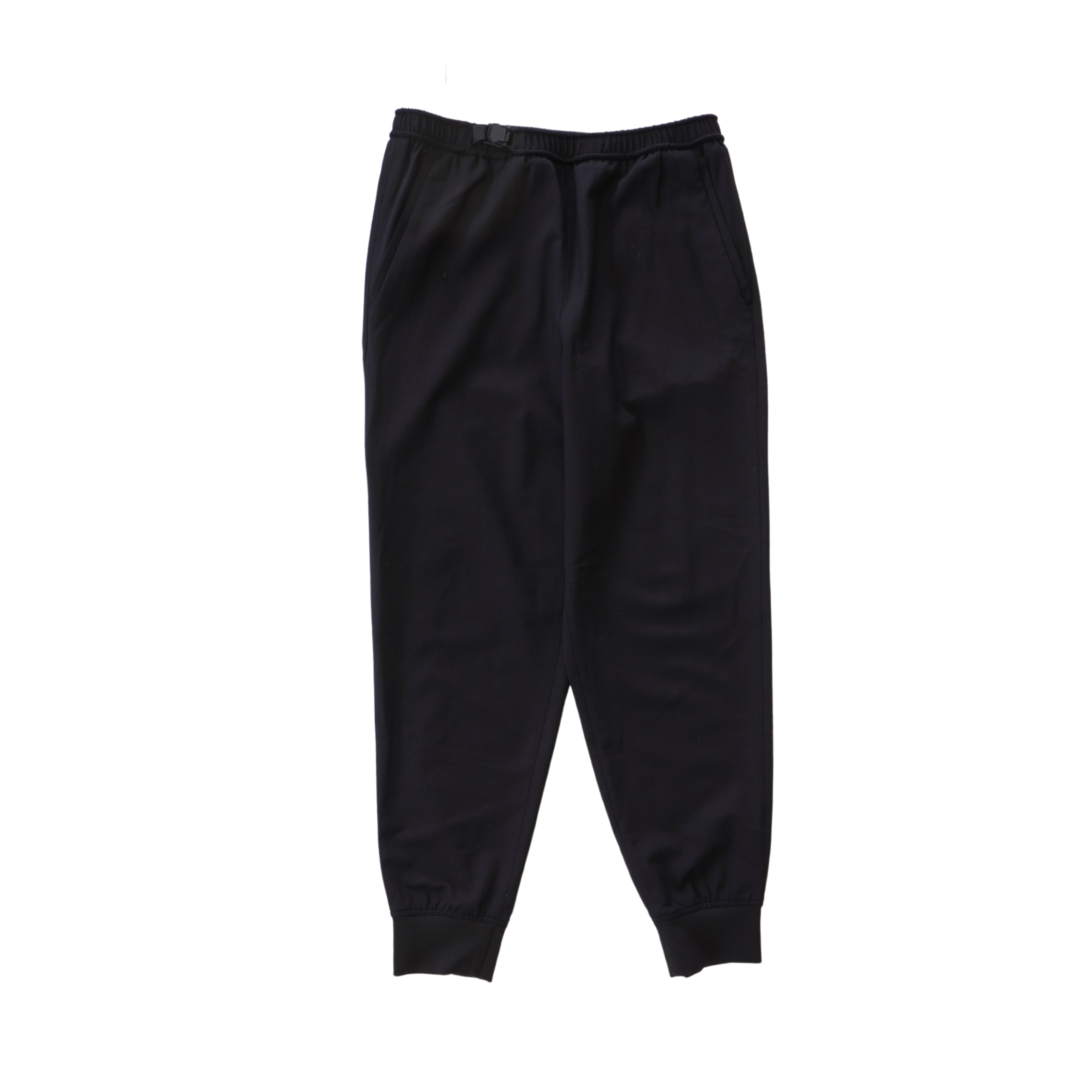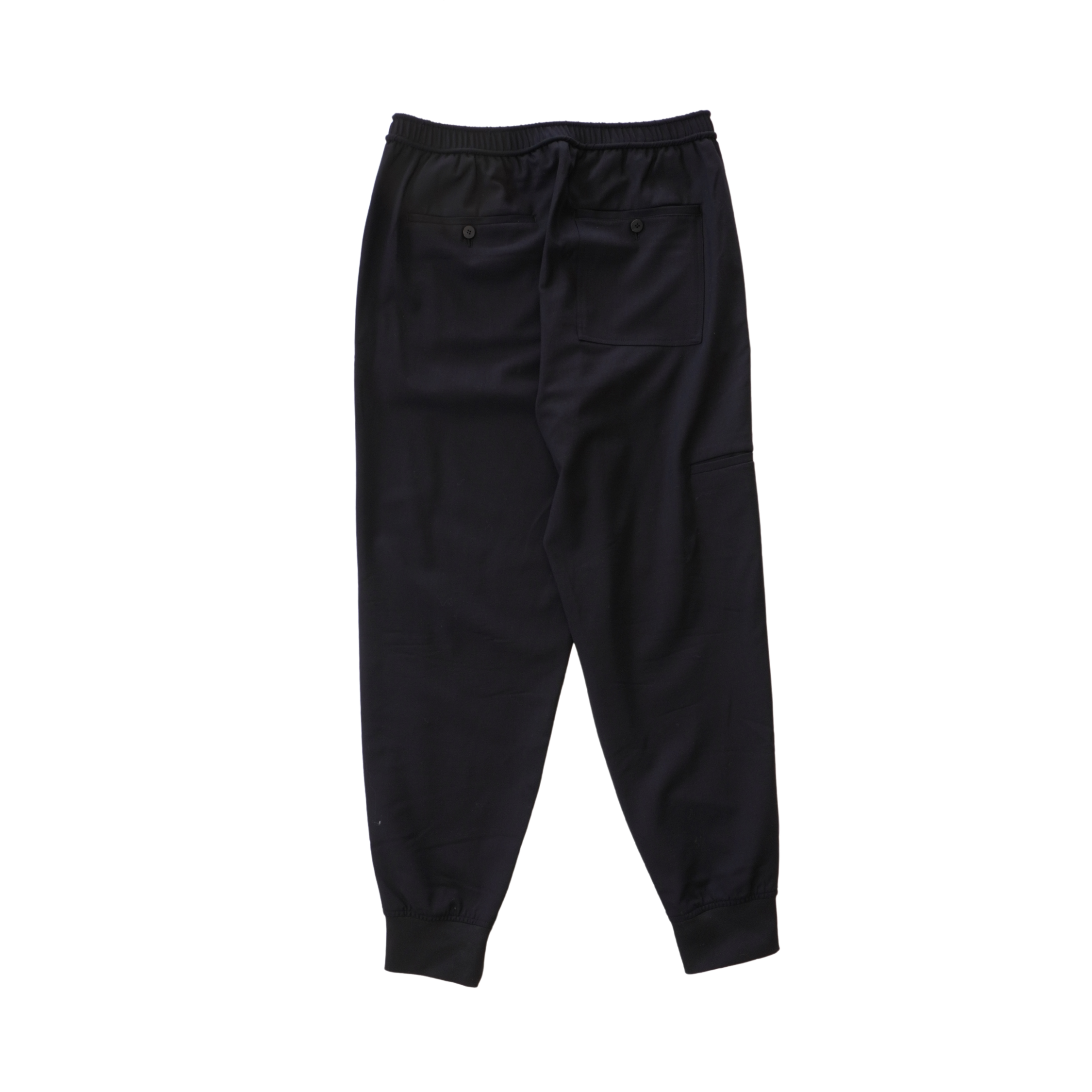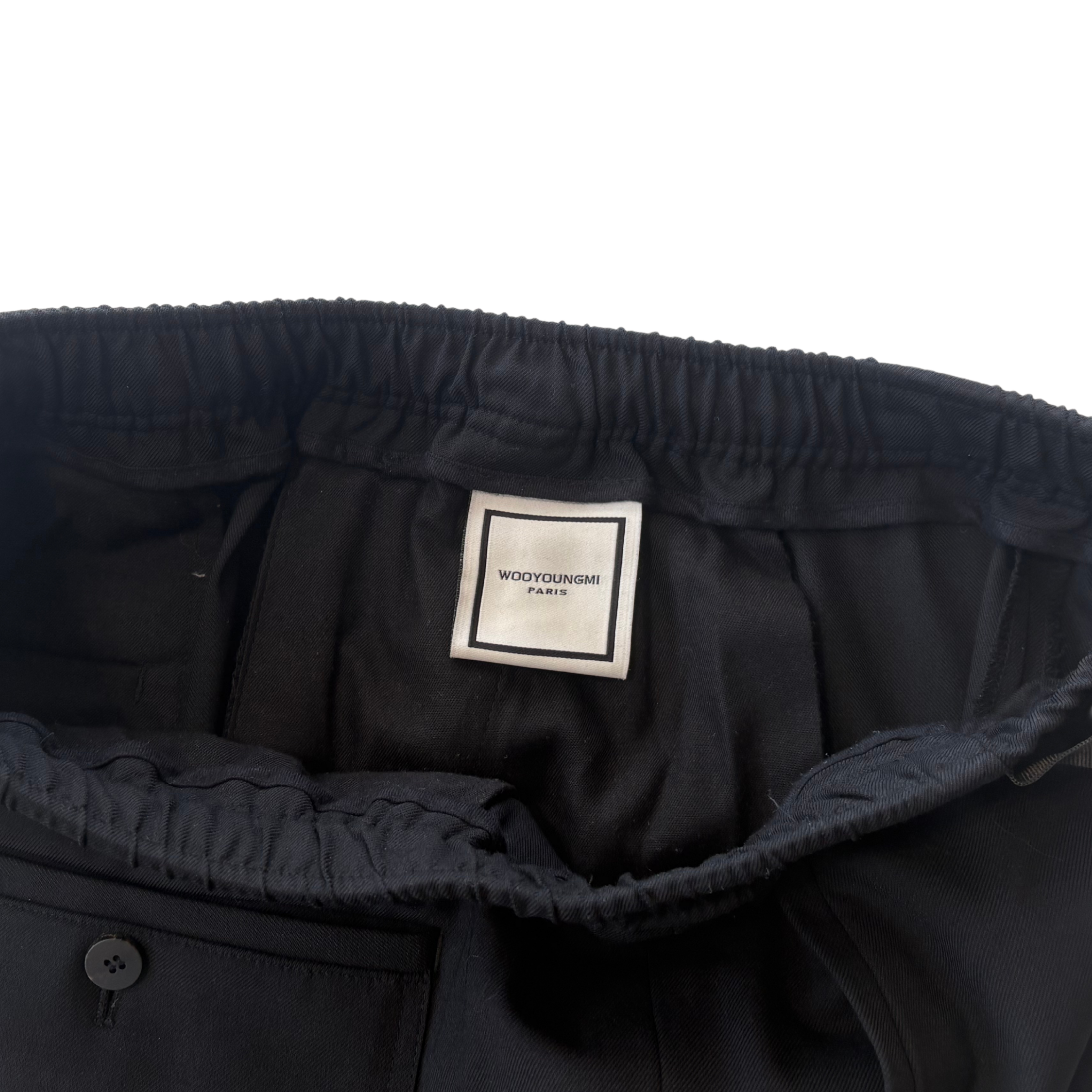 Wooyoungmi tapered trousers in a black stretch material with woven cuffs, two front slash pockets and two large back buttoned patch pockets. Featuring an elastic waistband with an attached magnetic acrylic belt closure.