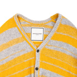 Wooyoungmi oversized cardigan in yellow and grey striped knit alpaca wool blend with large dark tortoise buttons and a ribbed knit trim throughout.