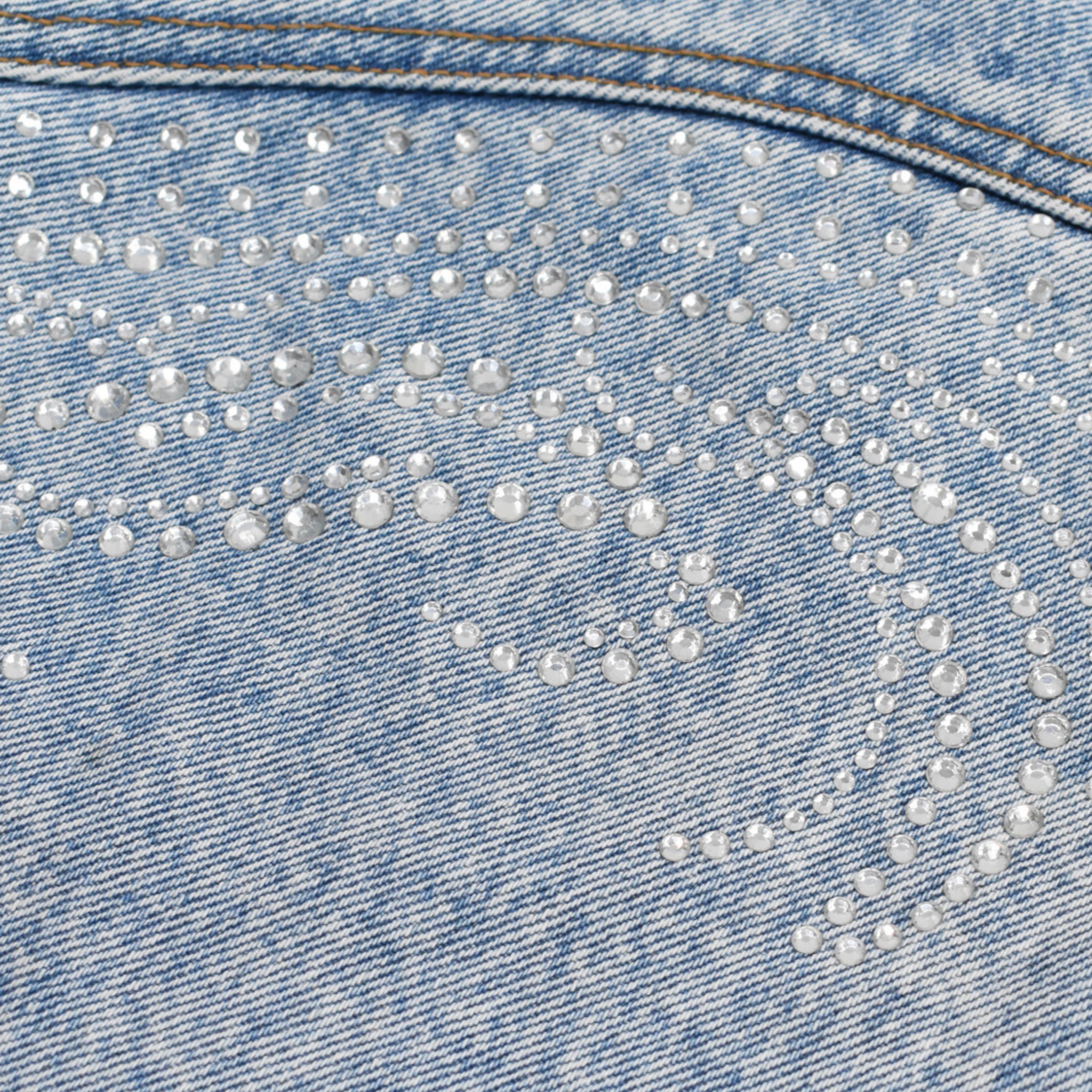Y/Project x SSENSE exclusive high-waisted wide-leg jeans in a light-wash cotton denim with five pocket styling, a front yoke panel and rhinestone detail on the front.